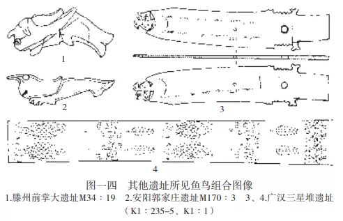 仰韶文化分佈區之外偶有魚形象的發現。雙墩文化的蚌埠雙墩遺址碗底刻畫符號中有簡化的魚形 ,河姆渡遺址發現有河姆渡文化的木魚 ,嘉興南河浜遺址 崧澤文化墓葬1件豆蓋上有一對魚形堆塑,良渚文化反山墓地中發現玉魚1件 。但這些零星發現均未反映魚鳥轉化的主題,很明顯,相關信仰是仰韶文化系統特有的宗教傳統。