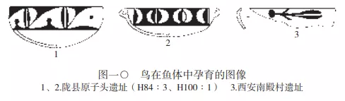 姜寨M76:10圖像的魚頭中,鳥頭邊有一裂開的卵形物(見圖二:3)。隴縣原子頭遺址H84:3缽的彩陶圖案也表現了魚體內的鳥和裂開卵形物的組合(圖一〇:1)。原子頭H100:1缽則表現了魚體內半黑半空白和黑色的卵形圖案(圖一〇:2)。西安南殿村遺址 缽上則直接繪製了鳥從有裂縫的卵形物中飛出的狀態(圖一〇:3)。魚和鳥同為卵生,這可能是形成魚鳥化生信仰的依據。