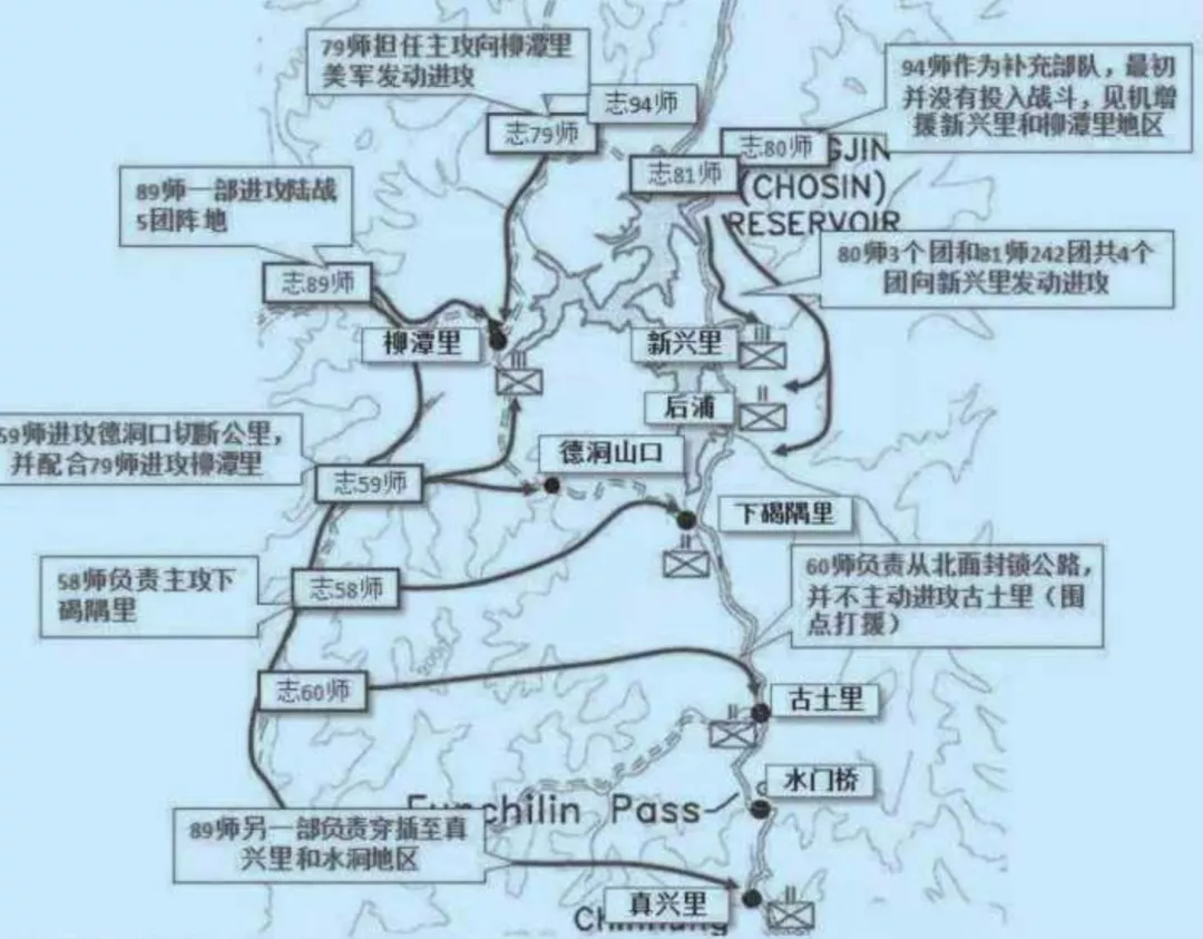 9兵團命79師主攻柳潭裏,94師作為預備隊,59師在德洞嶺負責打援;80師進攻新興裏的美31團,58師進攻下碣隅裏,81師監視美32團,89師赴社倉裏,60師切斷陸戰1團和下碣隅裏的聯繫。志願軍同時進攻三個方向:柳潭裏、新興裏和下碣隅裏。還把大量兵力用於預備隊,監視打援軍。3個進攻方向上,志願軍的兵力總共只有三個多師,3.3萬人,美軍是1.5萬人,只有2.2比1的優勢。