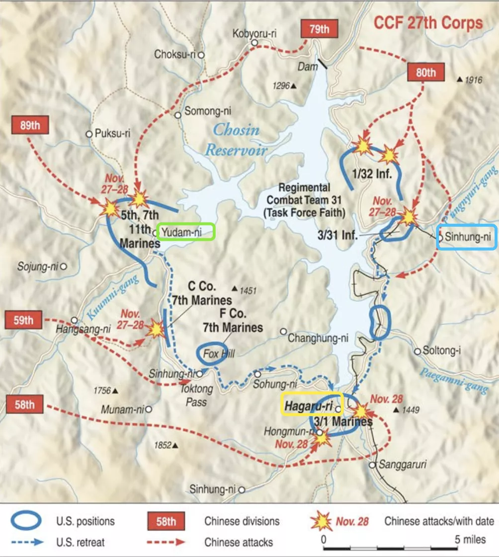 長津湖戰役有三個主戰場。柳潭裏(上圖左側綠框),新興裏(上圖右側藍框),下碣隅裏(上圖下方黃框)