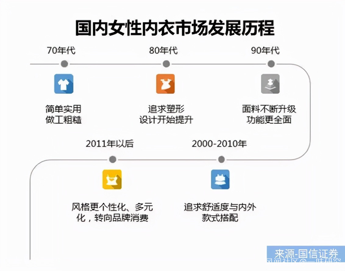 根據國信證券資料顯示,國內女性內衣市場正由過去簡單、實用為主的功能型保守消費觀,向追求時尚、氣質、舒適、健康、自然等方面的情感型消費觀轉變,內衣品類的消費升級屬性十分明顯。