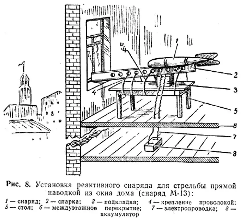 火箭攻擊組在距離目標約150米的大樓上佈置了武器。**3枚300毫米M-31火箭彈被放置在二樓的窗口。**在這種情況下,火箭將以約40-45°的彈着角度擊中目標建築物半米厚的牆壁。突擊小組瞄準二樓和三樓之間的空隙,即預計的敵方戰鬥人員所在的位置。