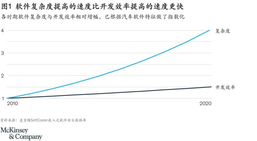 根據麥肯錫報告顯示,無論功能層面還是架構層面,汽車軟件的複雜度都在升高,而開發工作的效率卻沒有以同等速率跟上。