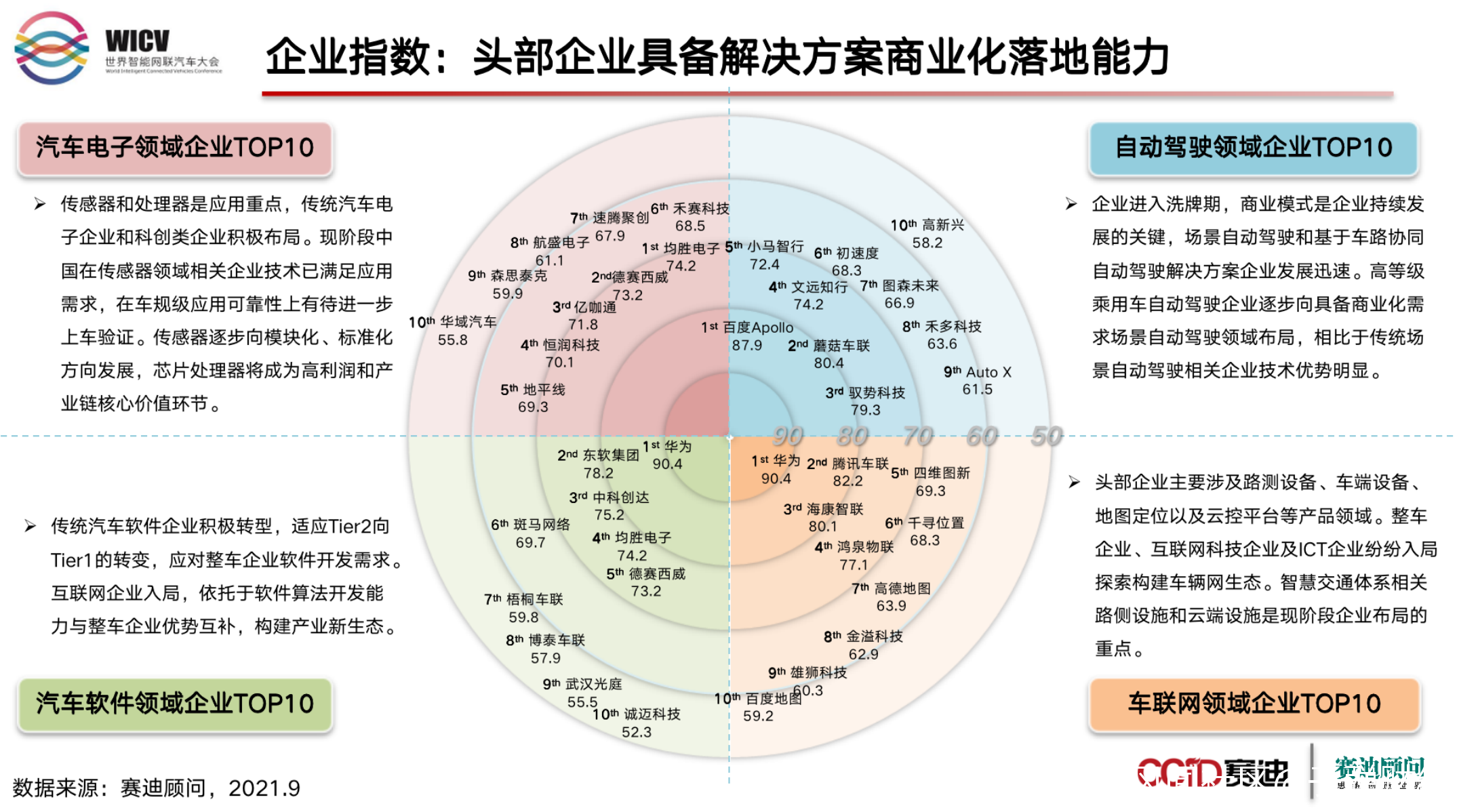 9月27日,中國電子信息產業發展研究院發佈的《智能網聯汽車產業發展報告(順義指數2021)》顯示,百度Apollo與蘑菇車聯分列前兩名,分別以87.9分和80.4分的綜合表現引領中國自動駕駛行業發展。報告表示,自動駕駛企業進入洗牌期,落地能力和商業模式是企業持續發展的關鍵,擁有場景和基於車路協同的自動駕駛解決方案的公司發展迅速。