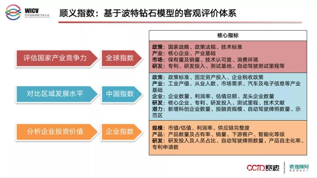 順義指數基於美國哈佛商學院教授、戰略管理學家邁克爾·波特的鑽石競爭力評估模型。這一模型用於分析國家某種產業在國際上為什麼具有較強的競爭力。順義指數在此基礎上提出“企業指數”,從規模、產品和研發三個維度,分析自動駕駛企業的投資價值。所涉數據來自企業年報、政府工作報告、調研統計、相關專利數據庫、萬得經濟數據庫等。