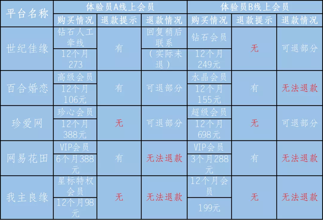 在售後退款方面,世紀佳緣、珍愛網、我主良緣三家服務協議均有一方非法定原因解除合同,可扣除部分金額後退款約定,但執行中世紀佳緣B店無視合同約定拒絕退款;世紀佳緣A店雖然最終完成退款,但耗時三個月;珍愛網退款相對順利,平均用時約半個月;我主良緣退款用時約2個月。總的來説,從申請退款到能退款成功,平均用時超過一個月,平台存在拖延情況。