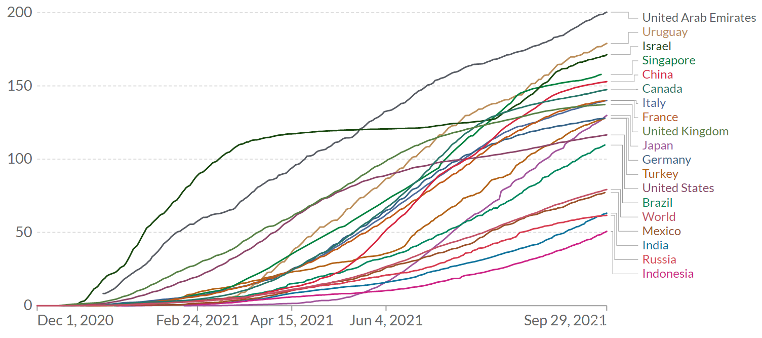 世界主要大國**+**部分小國每百人接種劑次(2020.12.1~2021.9.29)