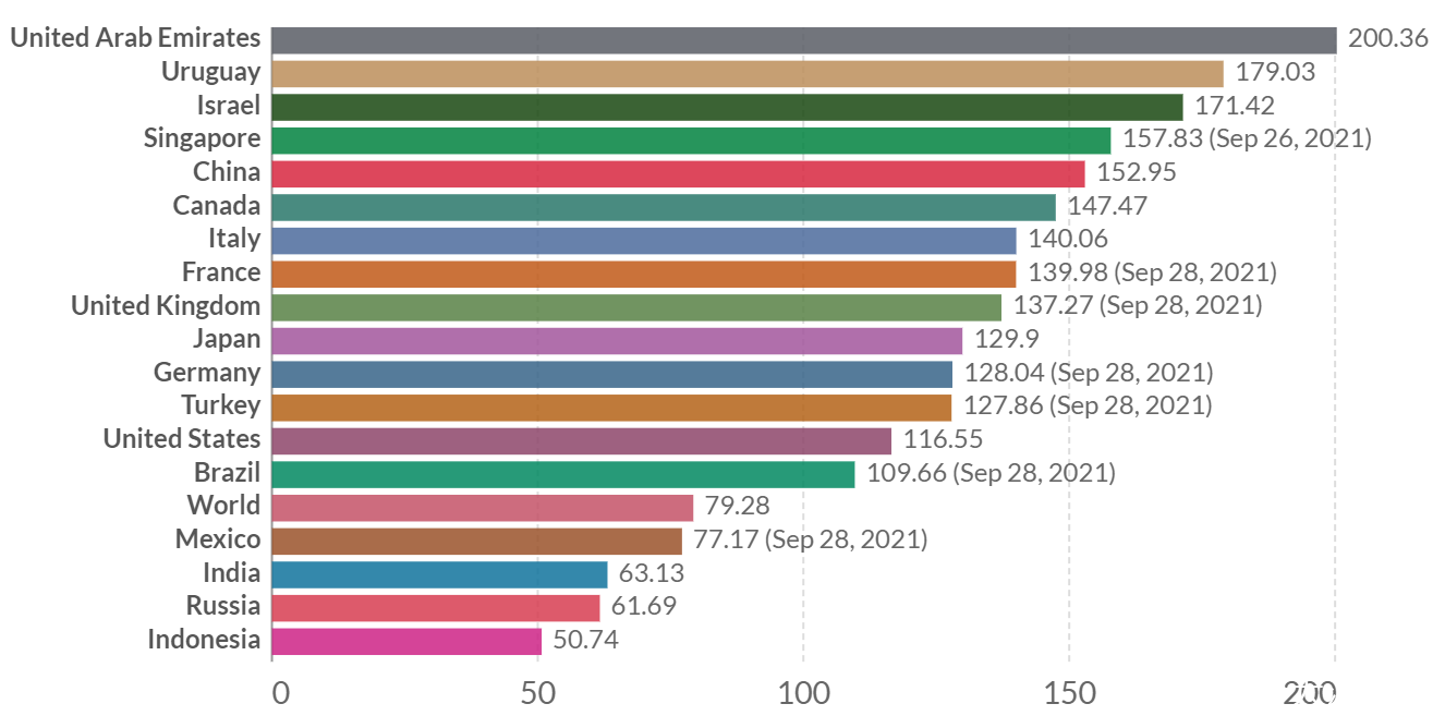 世界主要大國**+**部分小國每百人接種劑次(2021.9.29)