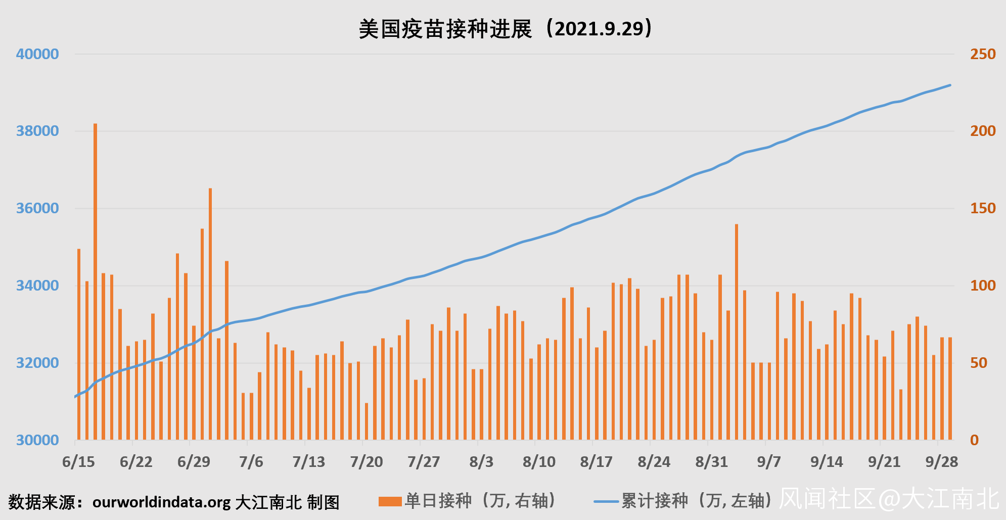 截止2021年9月29日,美國累計接種3.9199億劑,居全球第三位,其中單日新增接種67萬劑。美國每百人累計接種116.55劑,比中國低39.92劑,是中國的74.5%。