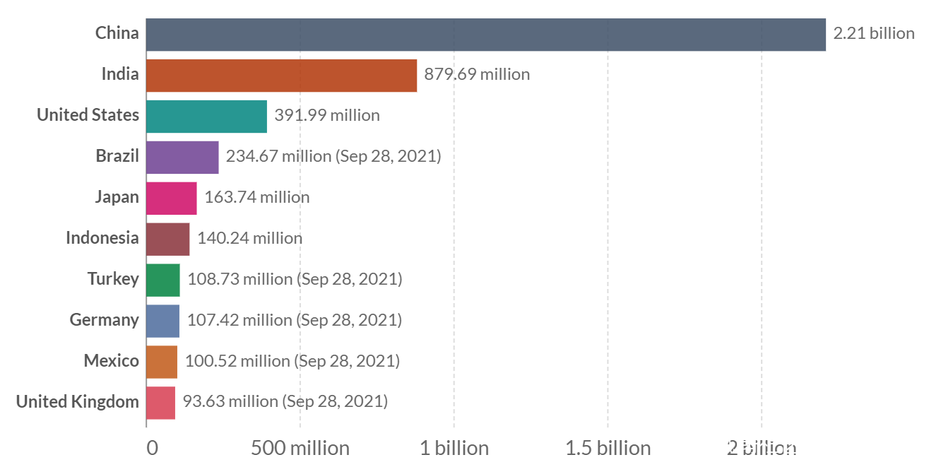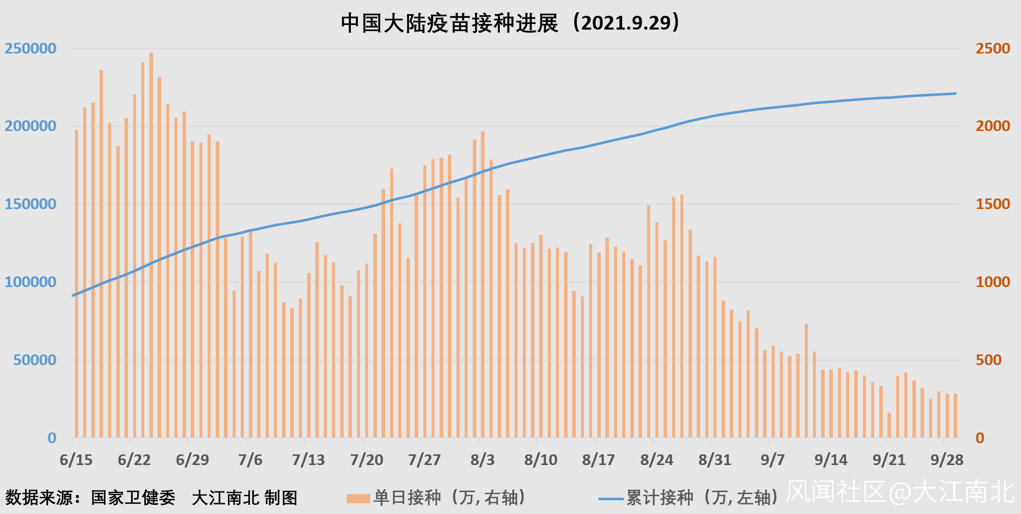 截止2021年9月29日,中國大陸累計接種新冠疫苗22.0892億劑,繼續位居全球第一位,佔全球累計接種劑數的35.4%;其中單日新增接種287萬劑,佔全球單日接種劑數的11.3%。中國每百人累計接種156.46劑,環比增加0.20劑,是美國的1.34倍,位居世界主要大國之首。