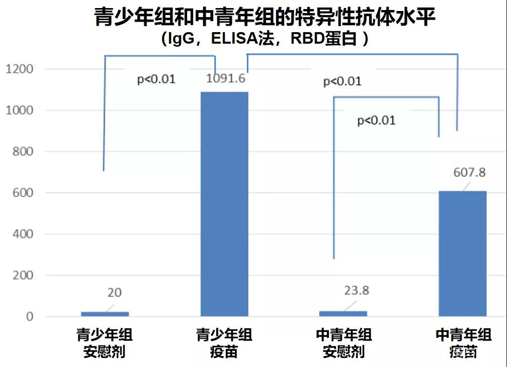 免疫原性:青少年組接種1劑克威莎28天后,其特異性抗體(IgG,ELISA法,RBD蛋白 )水平為1091.6, 中青年組接種1劑後28天,其特異性抗體水平為607.8,且青少年組顯著高於中青年組。
