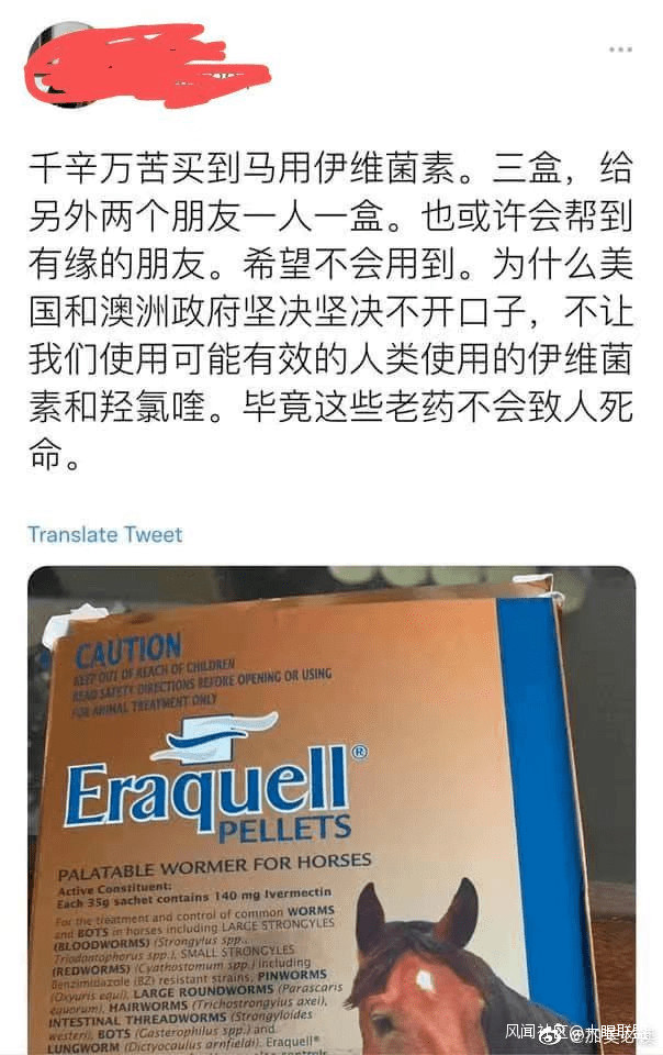來自FDA網站紐約時報報道説,由於美國人信了伊維菌素可以治療新冠的虛假信息,獸醫、牧場主和農場主不得不想辦法應對這種馬用驅蟲藥伊維菌素短缺。。