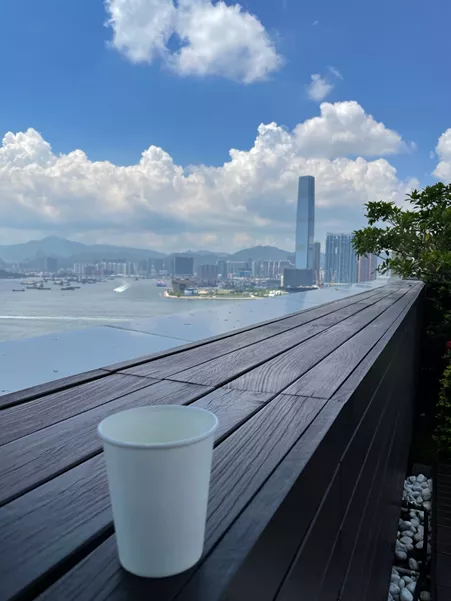 有一次,公司天台搞個環保活動,中午可以看着這個美麗的維港在天台喝特調飲品,感覺自己去了Rooftop bar一樣,真chill!
