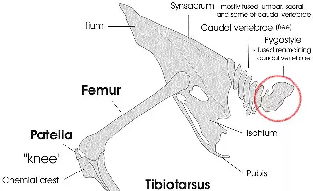 現代鳥類的骨骼,紅圈裏的部位是尾綜骨(pygostyle) | Squelette_oiseau / Wikimedia Commons