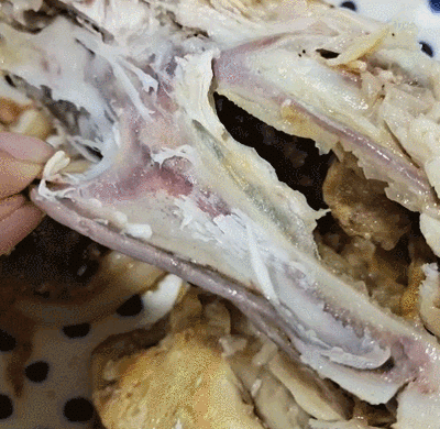 現代鳥類的龍骨突(日曆娘在燒雞上拍攝了這一張,就知道有一天會有用的!),附着胸肌作為飛行的動力 | 日曆娘