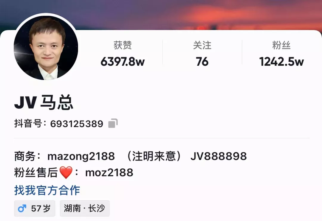 抖音上有個叫做JV馬總的人,長得就和馬雲很像,粉絲數有1200多萬。