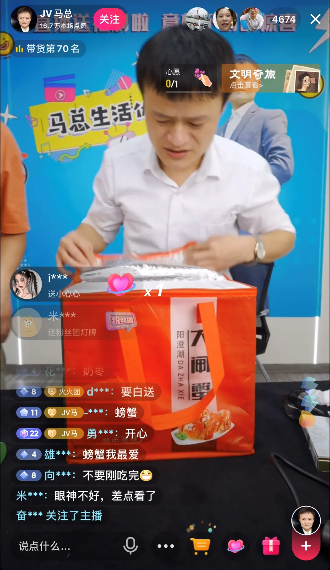 碰巧的是,胖爺我在寫這篇文章的時候,碰巧趕上他在直播帶貨,賣的陽澄湖大螃蟹,張口閉口就自稱是馬總,彈幕也很配合。