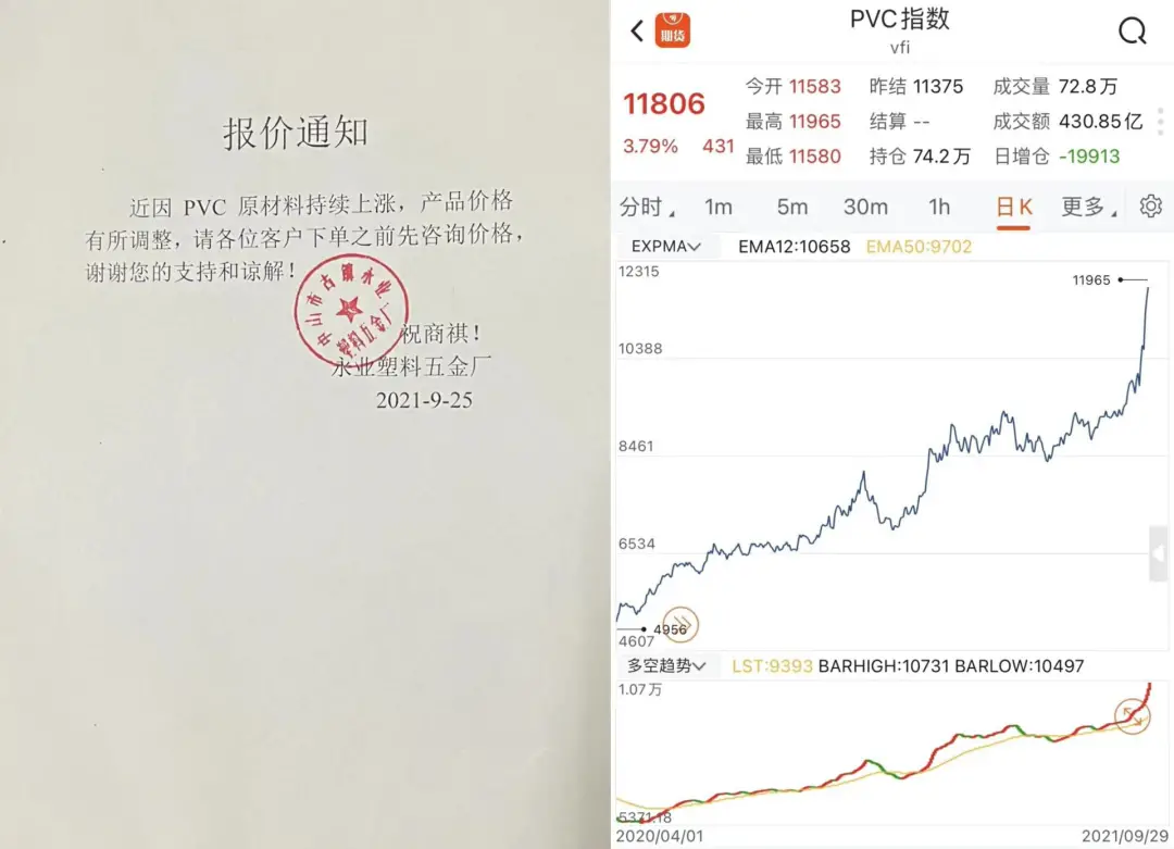 比如我最近就沒拿材料,生產節奏也放慢了。對於下游,一些熟的、好收錢的客户,就供庫存貨,但價格也是一天一個價,可能上個星期8000元/噸的貨,今天可能就要9000元/噸,所以我都通知客户先詢價。你看,PVC指數兩日升了1000。