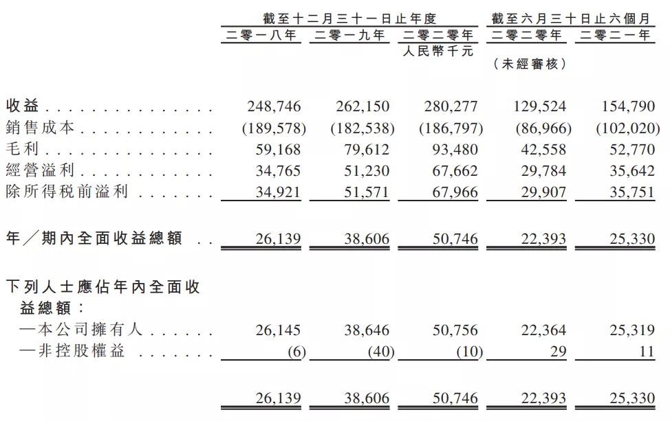 從財務角度來看,近三年內,公司收益總體維持平穩且温和的增長趨勢,由2018年的約2.487億元(人民幣,單位下同)增加至2019年約2.622億元,並進一步增加2020年的約2.803億元。上半年內,公司的總收益2020首六個月的1.295億元增加至2021首六個月的約1.548億元。