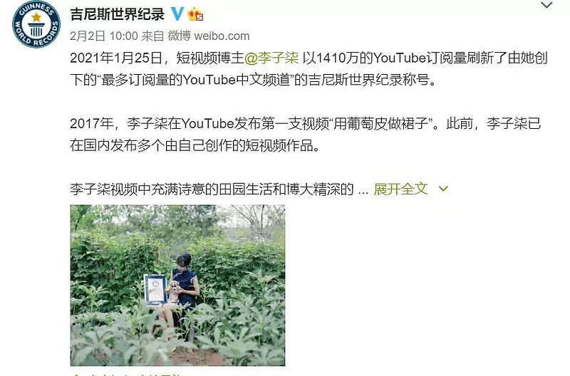 今年1月,李子柒以1410萬的YouTube訂閲量,刷新了由她本人創下的“最多訂閲量的YouTube中文頻道”吉尼斯世界紀錄稱號。