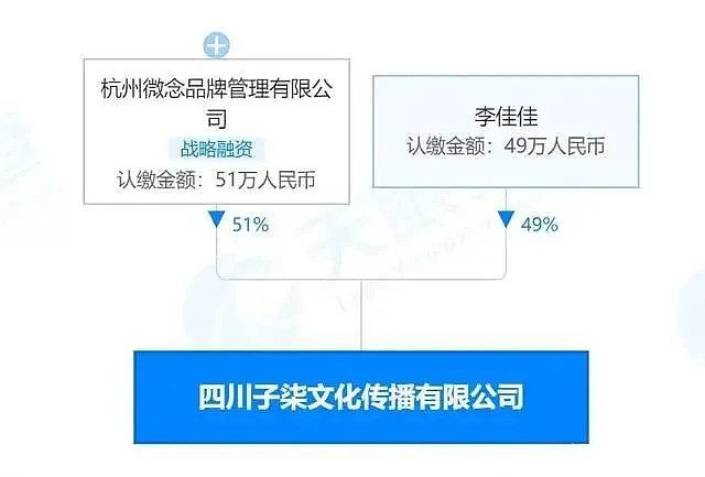 李子柒與微念合作成立的四川子柒文化傳播有限公司,李子柒(李佳佳)持股49%,杭州微念持股51%。