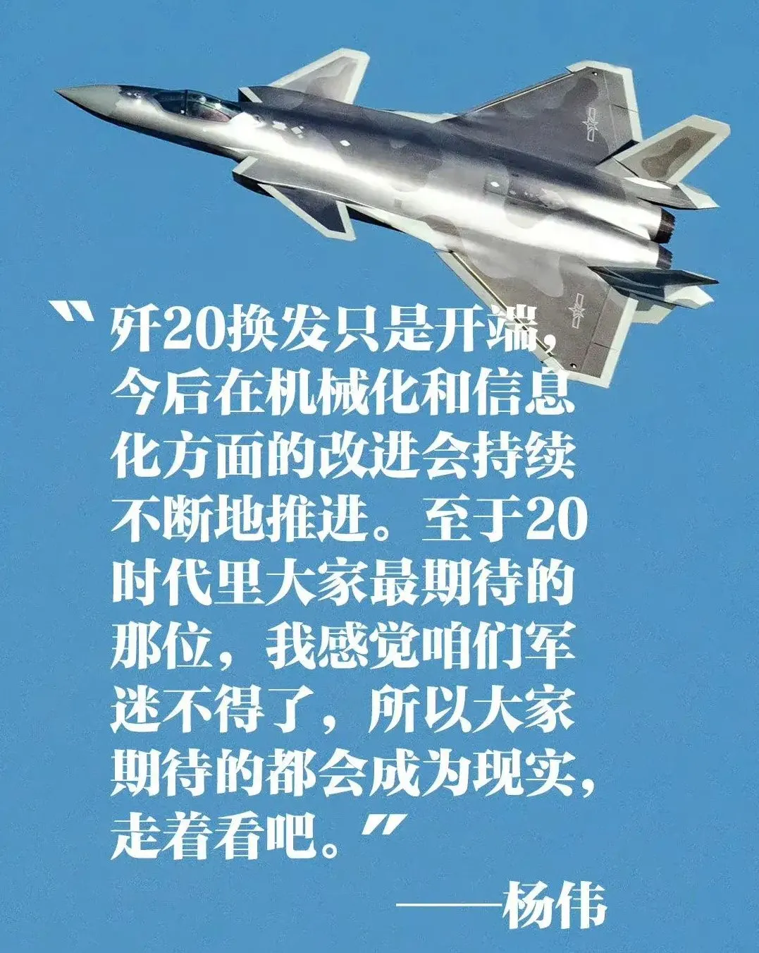 在本屆航展開幕式上,有軍迷發現參演的殲-20戰機的發動機有了不少新變化,包括噴口和鋸齒跟以前都不一樣。中國空軍新聞發言人申進科表示説,殲-20隱身戰鬥機已經用上了新型國產發動機。他還説,殲-20用上了“中國心”,這個心,是心臟的“心”!為中國心點贊!此外,殲-20總師楊偉也透露殲-20已經換裝國發。這也是殲-20換裝國產發動機後首次對外公開展示。