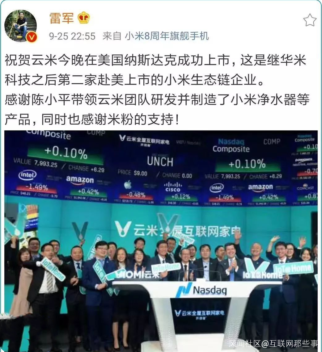 公開資料顯示,雷軍曾親口承認,雲米是繼華米之後,第二家赴美上市的小米生態鏈企業,而很多人不知道的是,雲米創始人陳小平,就是受雷軍感召才從前東家美的出來另立山頭的。而小米這些年也一直是雲米的第二大股東。