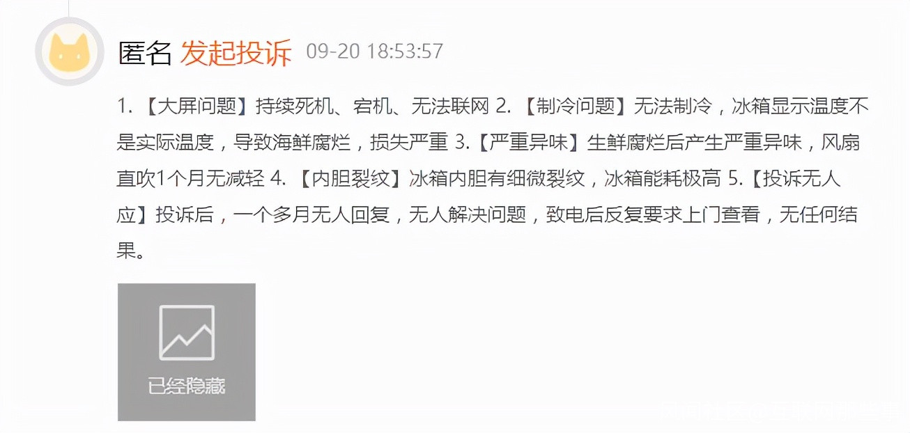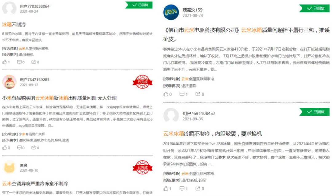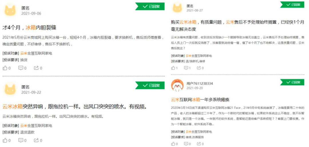 在黑貓投訴平台,我們發現,有關雲米冰箱的170餘條投訴中,僅僅看時間最近的8~9月份,我們發現,大多數仍然是與冰箱製冷效果、內膽故障以及售後拒不履行三包等問題的維權。