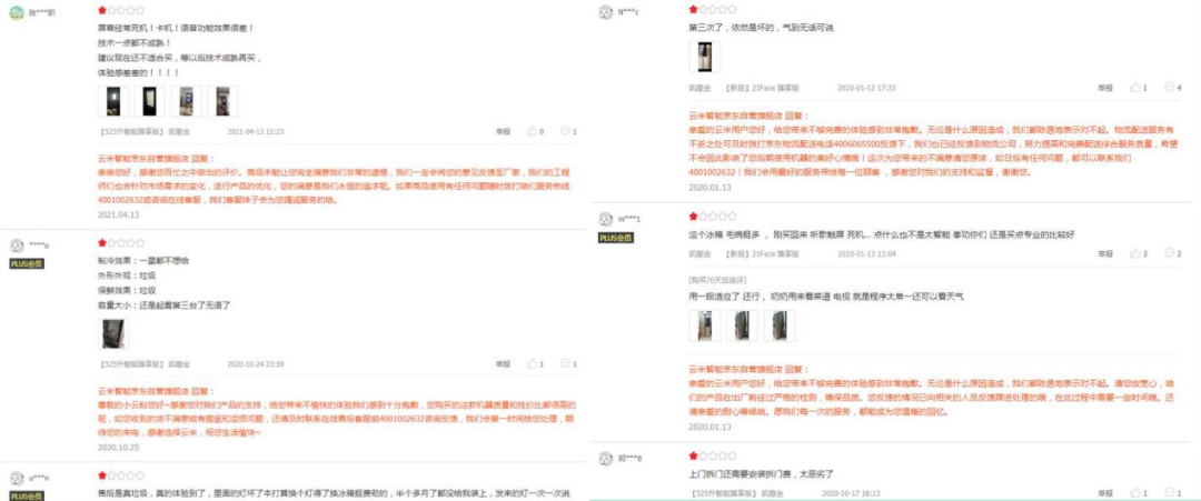 在幾個大電商平台,我們發現雲米冰箱有好評有差評,整體上好評居多,不過好評主要集中在對冰箱性價比顏值與容量等評價維度,所以,對於欲購買的用户,參考意義不大,而在集中的差評中,我們發現,更多反映的是硬件質量和軟件系統的問題,也許參考意義更大。