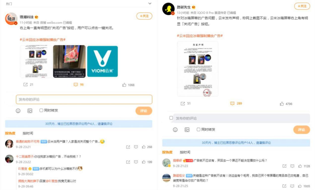 9月28日,#雲米冰箱強推廣告且不能關閉#登上微博熱搜,引輿情發酵,包括新浪科技、正觀視頻等多家媒體都第一時間跟進報道,大有云米不回應不能消停之勢。