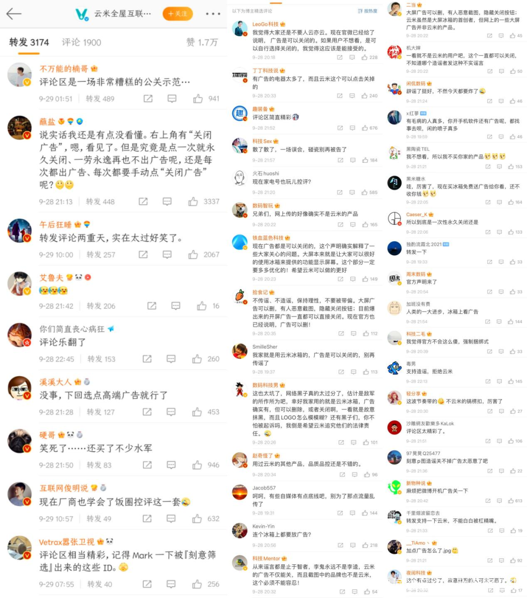 9月27日,有網友貼吐槽自己花大價錢買的雲米冰箱,竟變成了大屏廣告機,並呼籲大家千萬別買,隨後引發不少網友共鳴,越來越多的社交平台開始出現雲米冰箱強推廣告相關的熱議話題。
