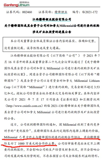 隨後,贛鋒鋰業發佈公告稱,近日,公司收到贛鋒國際的通知,因Millennial收到了要約競爭對手的“更優報價”,且贛鋒國際未在約定期限內選擇上調要約價格,Millennial已單方終止與贛鋒國際的要約收購合作協議,並向贛鋒國際支付了1000萬美元的合作終止費。