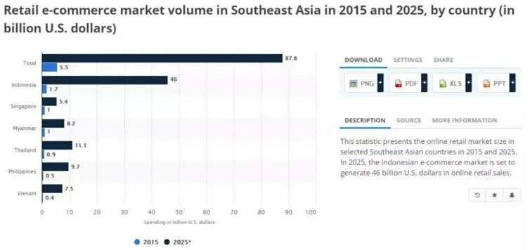 據Statista數據顯示,到2025年,東南亞地區主要國家(印度尼西亞、泰國、新加坡、馬來西亞、越南、菲律賓)的電子商務在線零售市場規模總計將達到878億美元。