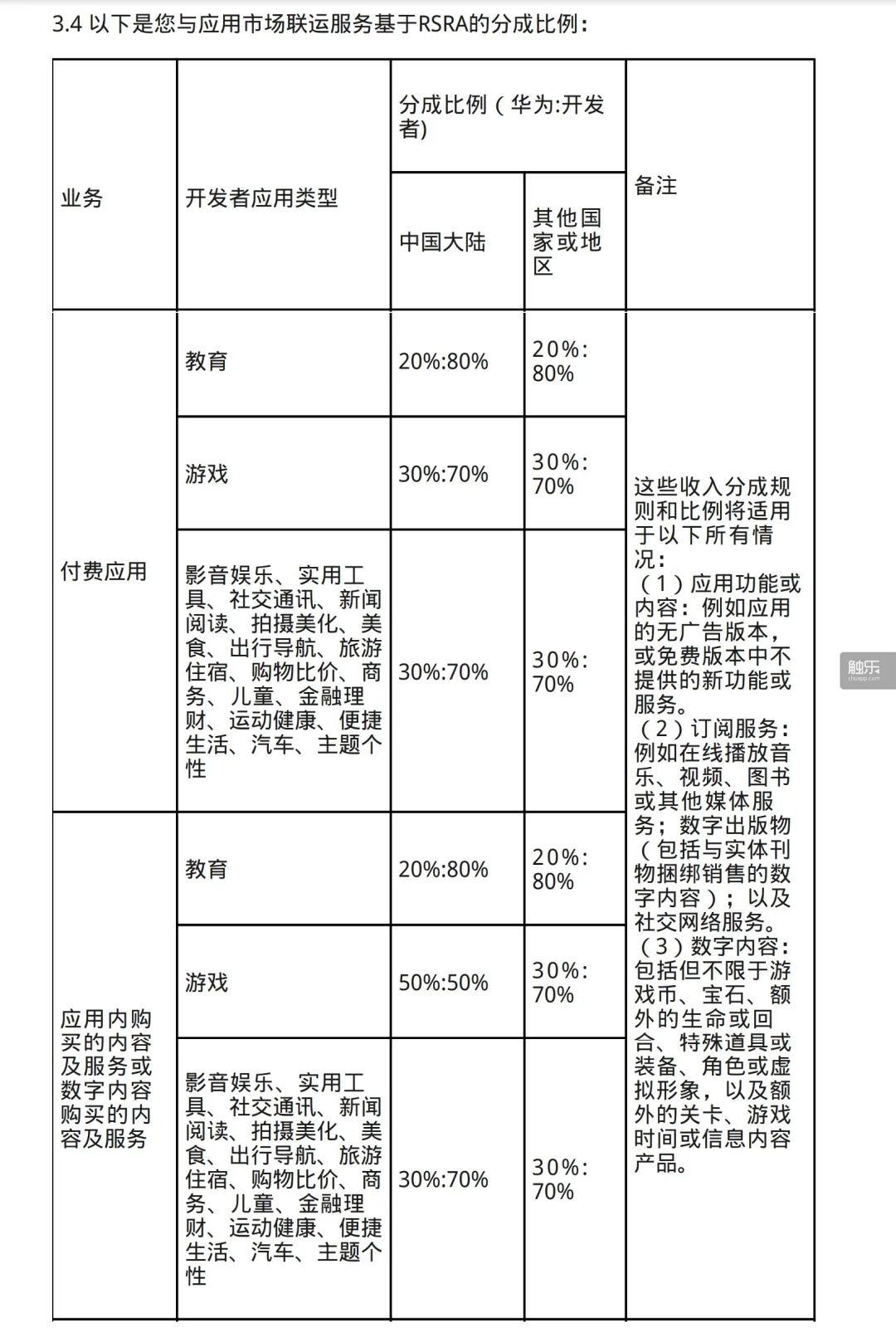 2021年1月27日更新的《華為應用市場聯運服務協議》,其中付費遊戲分成為30%,遊戲內購為50%
