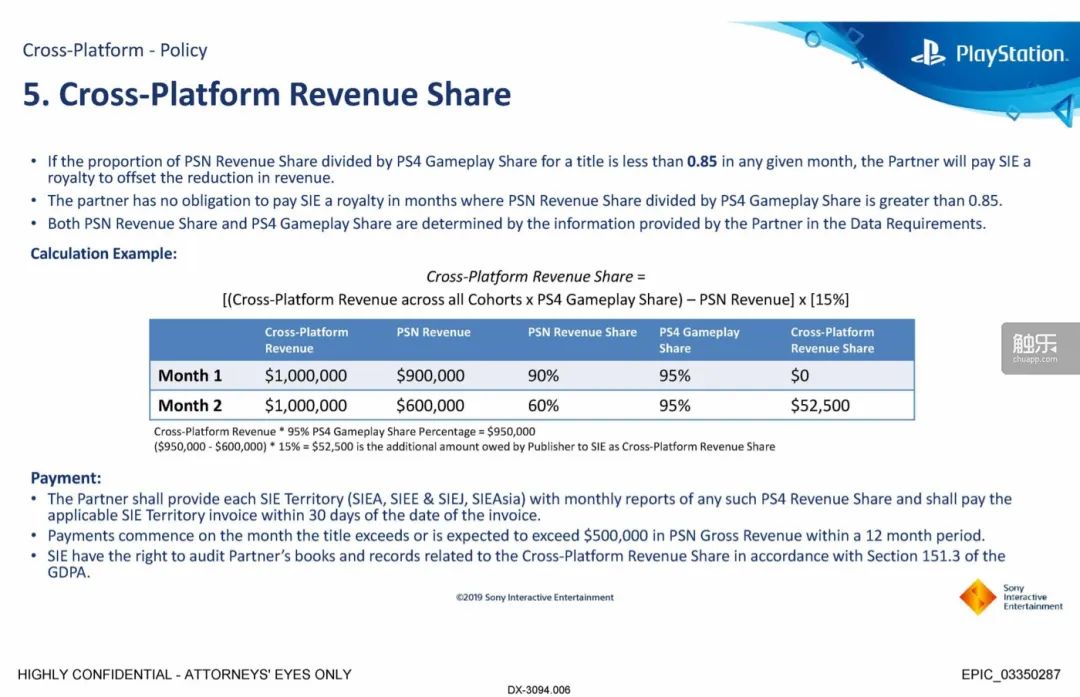 此次庭審中,Tim Sweeney的證詞裏提到了這件事。他表示,為了讓索尼同意跨平台聯機,Epic按照對方的要求支付了跨平台費用。當然,索尼的跨平台費用並非針對Epic一家,而是對所有開發者都“一視同仁”——如果一款遊戲某個月在PS平台的收入份額與其玩家在PS玩家中所佔份額之比低於0.85,開發商就得付給索尼一筆“補償金”。