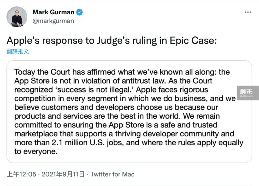 至於哪邊板子打得更重一些,或許可以從雙方的反應中看出些端倪。Epic一邊,CEO Tim Swenney得知判決結果之後立刻上推特發言,宣稱“判決對開發商和消費者來説都不是勝利,Epic正在為公平競爭而戰”;反觀蘋果,只發了一條“App Store沒有違反反壟斷法”的公告,頗為淡定。