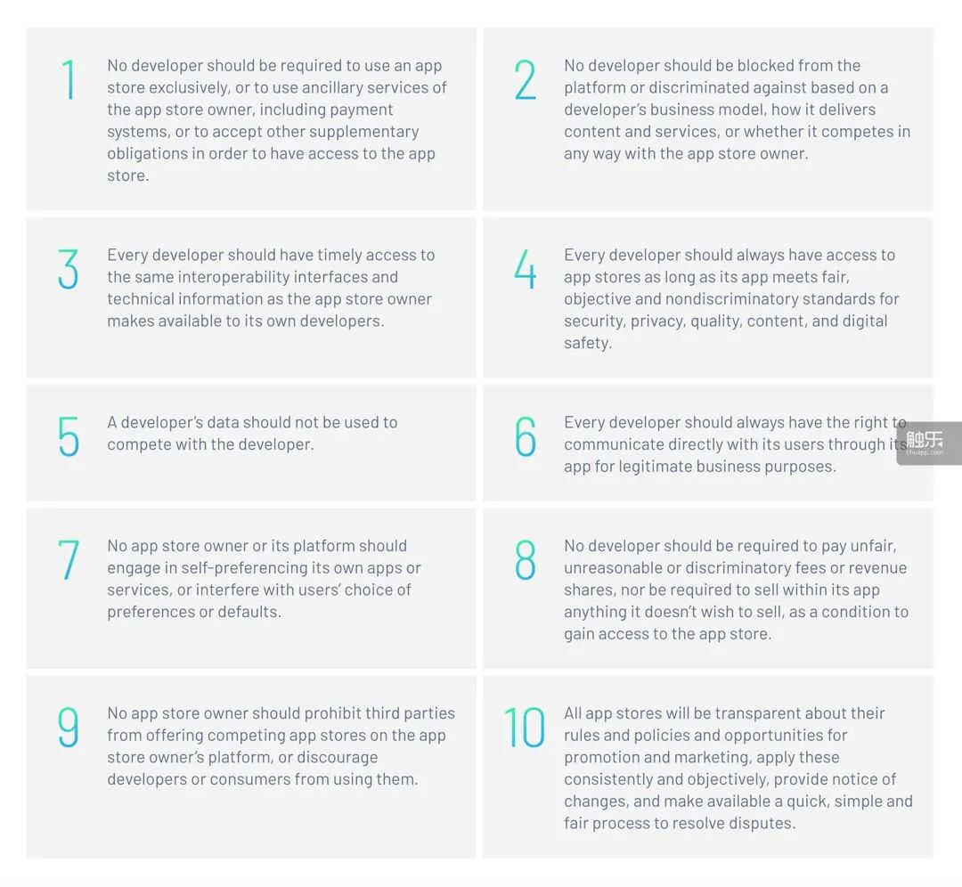 CAF對應用程序商店提出了10項願景。總結起來大致是,他們希望應用商店不對開發者設限,不論開發者使用什麼工具,選擇多少家商店、哪些服務、何種支付方式,怎樣與用户交流,他們開發的應用程序都不應被商店拒絕,或受到限制。