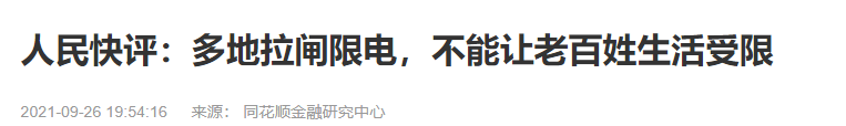 9月27日,人民網發佈題為**《多地拉閘限電,不能讓老百姓生活受限》**的“人民快評”,批評任意停止居民用電,影響民眾基本生活的現象。