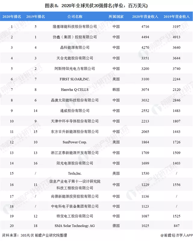 2019 年,全中國的光伏全中國光伏總裝機量達到了 205GW,佔全球光伏裝機量的 35.45%,全球光伏 20 強裏,也有 15 家是中國企業。