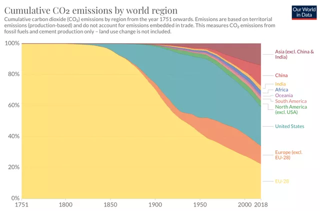 就拿瘋狂推崇環保、碳中和的歐洲各國來説,在幾百年前的工業革命時代,人家早就把該污染的空氣都污染完了。從 1850 年算起,歐美各國累計排放量了全世界約 50% 的碳。