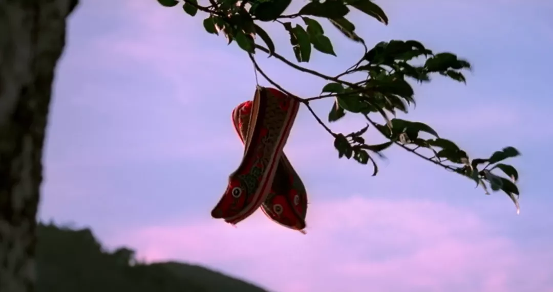 瘋媽答應孩子不用上學,兒子興奮得坐着拖拉機走了,瘋媽有點失神,把鞋子掛在了樹枝上。