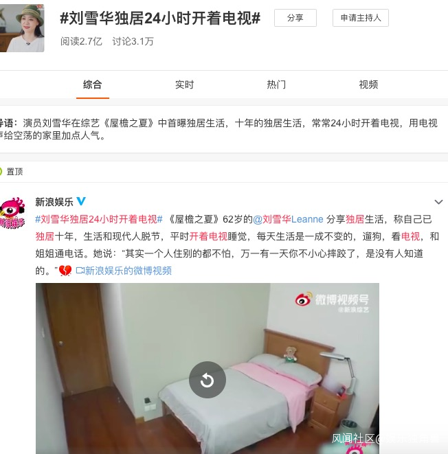 **銀髮時代正在全位面開啓,另一面卻是快節奏的經濟生活裏,老年人的情感需求正在被忽視。**近日,#劉雪華獨居24小時開着電視#登上微博熱搜榜,話題閲讀量超過2.7億,這則話題源於B站的一檔綜藝《屋檐之夏》。劉雪華分享自己的獨居生活稱:每天生活是一成不變的,遛狗、看電視、和姐姐通電話。