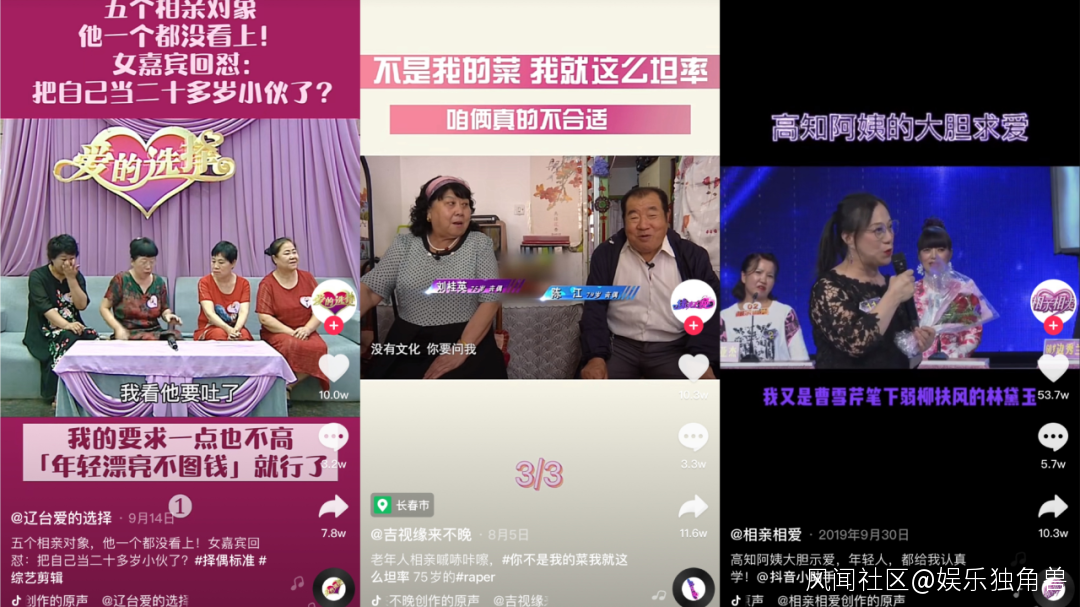 “抖音裏好多推送老年相親節目”、“抖音現在總給我推老年相親節目,太好笑了”……這是一場發源於抖音的快樂風暴,並且在“天天推送”、“關鍵詞搜索”等多重助攻下形成了一批忠實粉絲羣。而它同樣遵循着片段式傳播的基本路徑。
