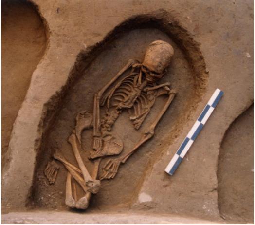 在黃河上游的有樂都柳灣、景泰張家台、廣河地巴坪等地,發現的多處屈肢葬墓距今4100年左右。