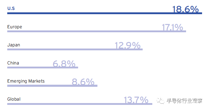 美國半導體製造商在美國的製造基地比其他任何國家都多,儘管這一比例在過去8年中穩步下降2020年,美國半導體製造商約43%的前端晶圓產能位於美國。這一比例從2013年的57%穩步下降。總部位於美國的前端半導體晶圓廠的其他產能領先地區包括新加坡、台灣、歐洲和日本。值得注意的是,與其他主要地區相比,中國大陸在前端製造方面吸引的美國投資則少得多。