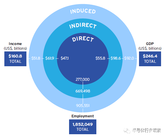 除了創造就業機會外,美國半導體行業對GDP和收入也有重大影響。2020年,美國半導體行業對GDP的貢獻為2464億美元。就收入影響而言,該行業在2020年為美國創造了1608億美元的收入,同時,也對其他行業產生了積極影響。例如,在該行業創造的185萬個直接和間接就業崗位中,許多都是在建築、金融活動、休閒和酒店等不同行業創造的。