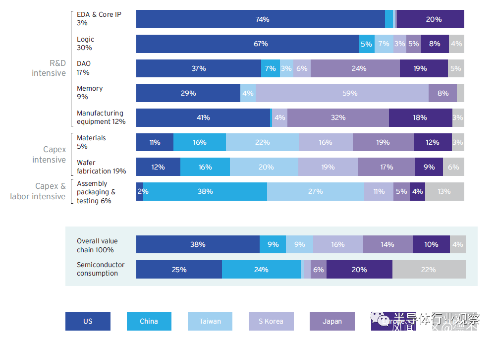 美國半的芯片設計是半導體行業的領導者。美國無晶圓廠公司約佔全球無晶圓廠公司銷售額的60%,一些自行設計的大型IDM也是美國公司。此外,美國在全球設計勞動力中所佔份額最大,這突出了美國芯片設計行業和學術生態系統的實力。鑑於半導體設計在製造過程增值方面的重要性,美國半導體行業在這一生產階段擁有並保持領先地位至關重要。