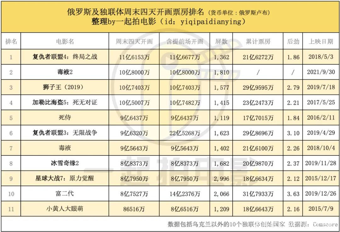 此外本片在俄羅斯50%的影院均受到疫情限座的背景下,以10.8億盧布拿下影史第二高開畫成績,其中週六單日達3.45億為同樣也是歷史第二高的非假期單日票房記錄。藉此俄羅斯週末大盤累計達13.6億盧布高位排在歷史第三,僅次於《復聯3》上映當週的14.4億和《最後的勇士》上映次周的13.7億。