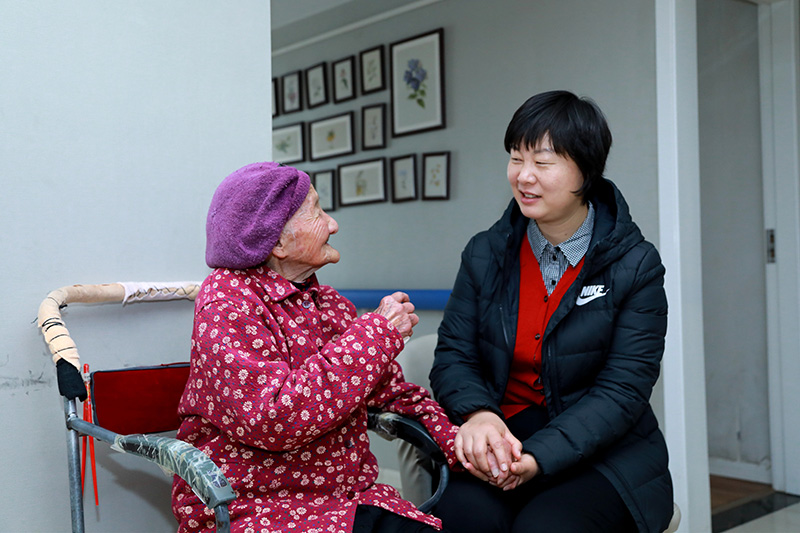 2020年1月1日,睢縣縣委書記吳海燕(右)在睢縣中醫院醫養中心看望慰問老人。新華社發