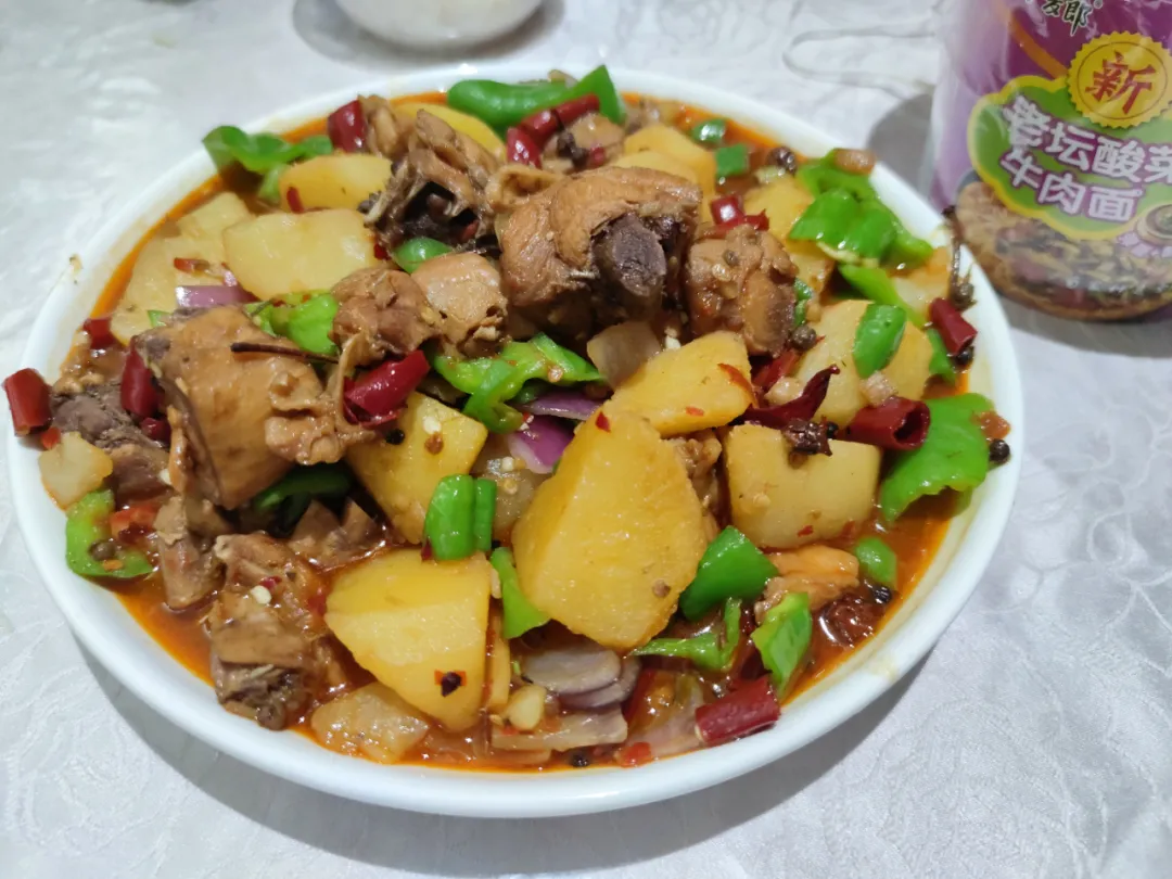 大盤雞端上來,有點出乎意料,色澤誘人,雞肉入味,土豆綿密,連青椒都可口,就是沒有皮帶面,兩碗米飯吃起來也有點粗糙和乾癟。我們狼吞虎嚥,邊吃邊拍照發給朋友炫耀,“我們在火車上吃到了正宗的大盤雞!”